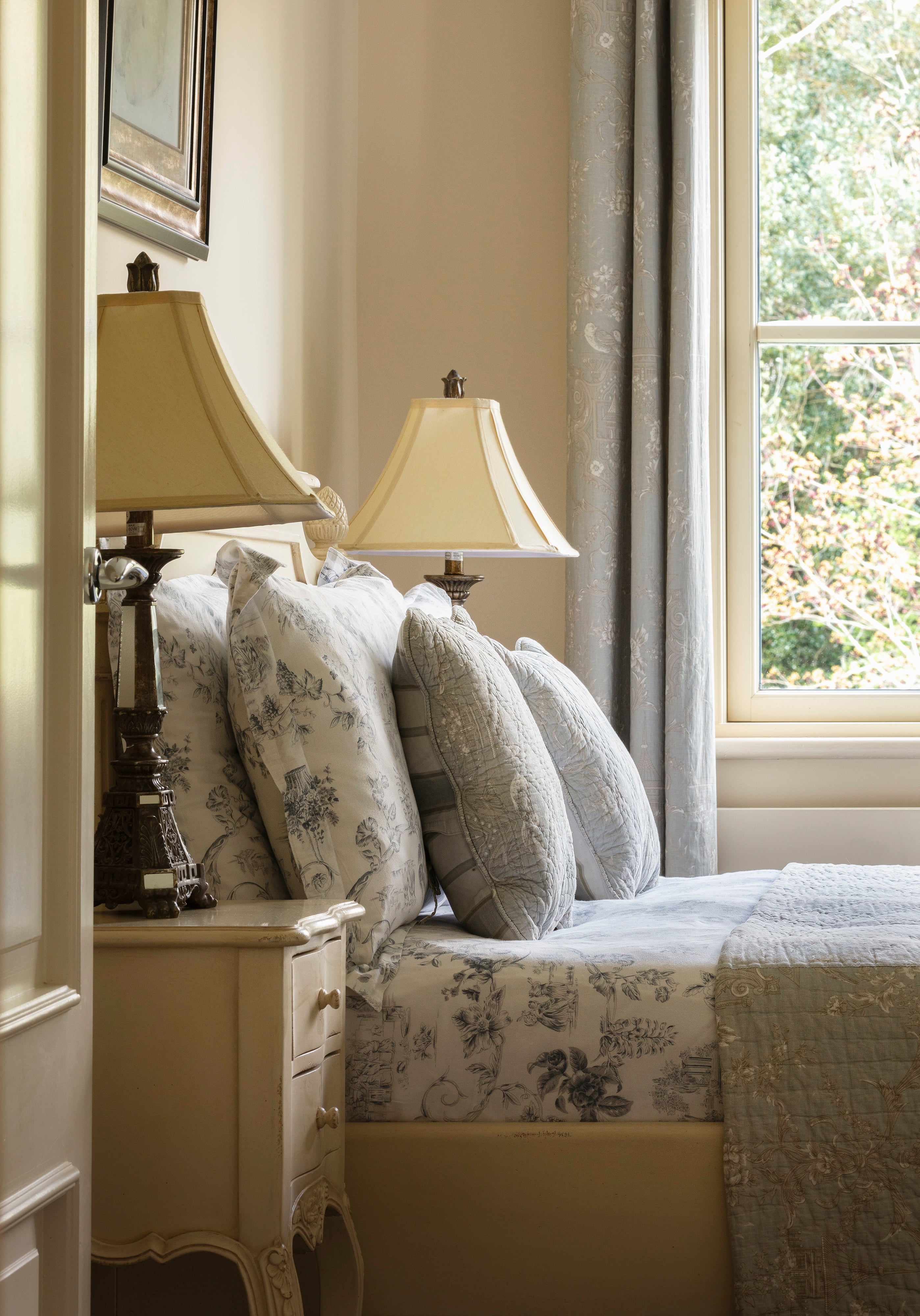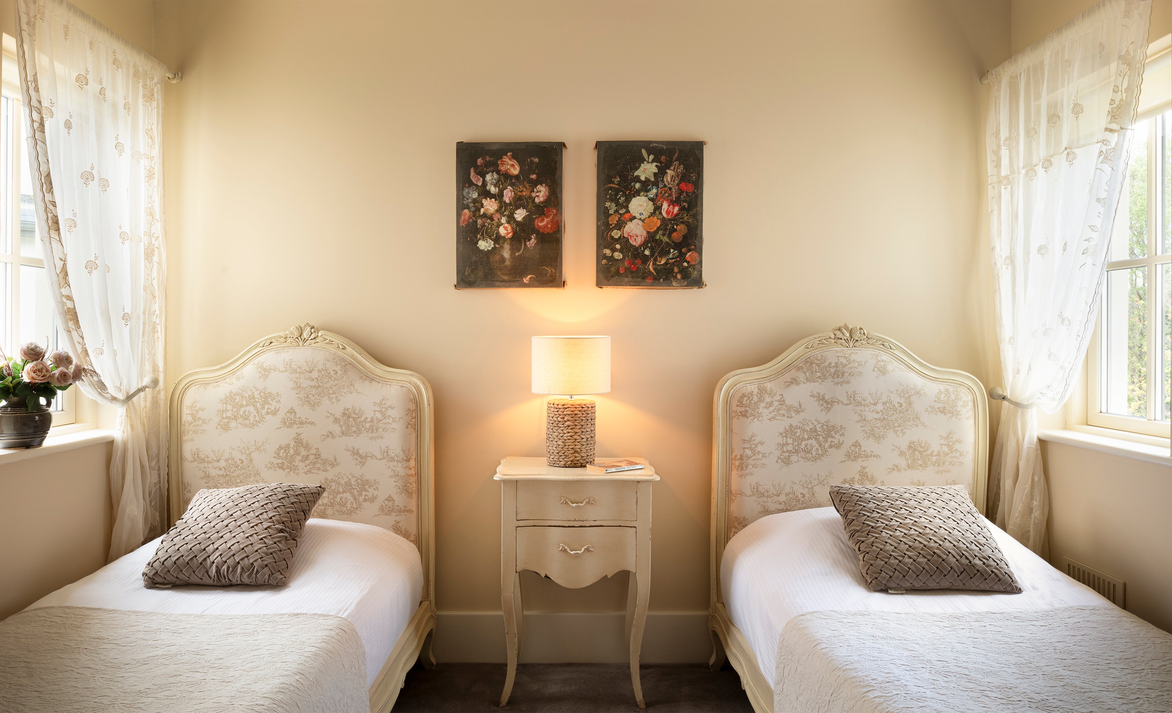 Further down the hall, the third bedroom features a beautiful double bed with an exquisite wall hanging over, nightstands & a wardrobe. The fourth bedroom, at the end of the hall, also has two single beds with coordinating curtains, bed frames, and a nightstand, as well as a wardrobe. Both rooms offer lovely views of the garden.
